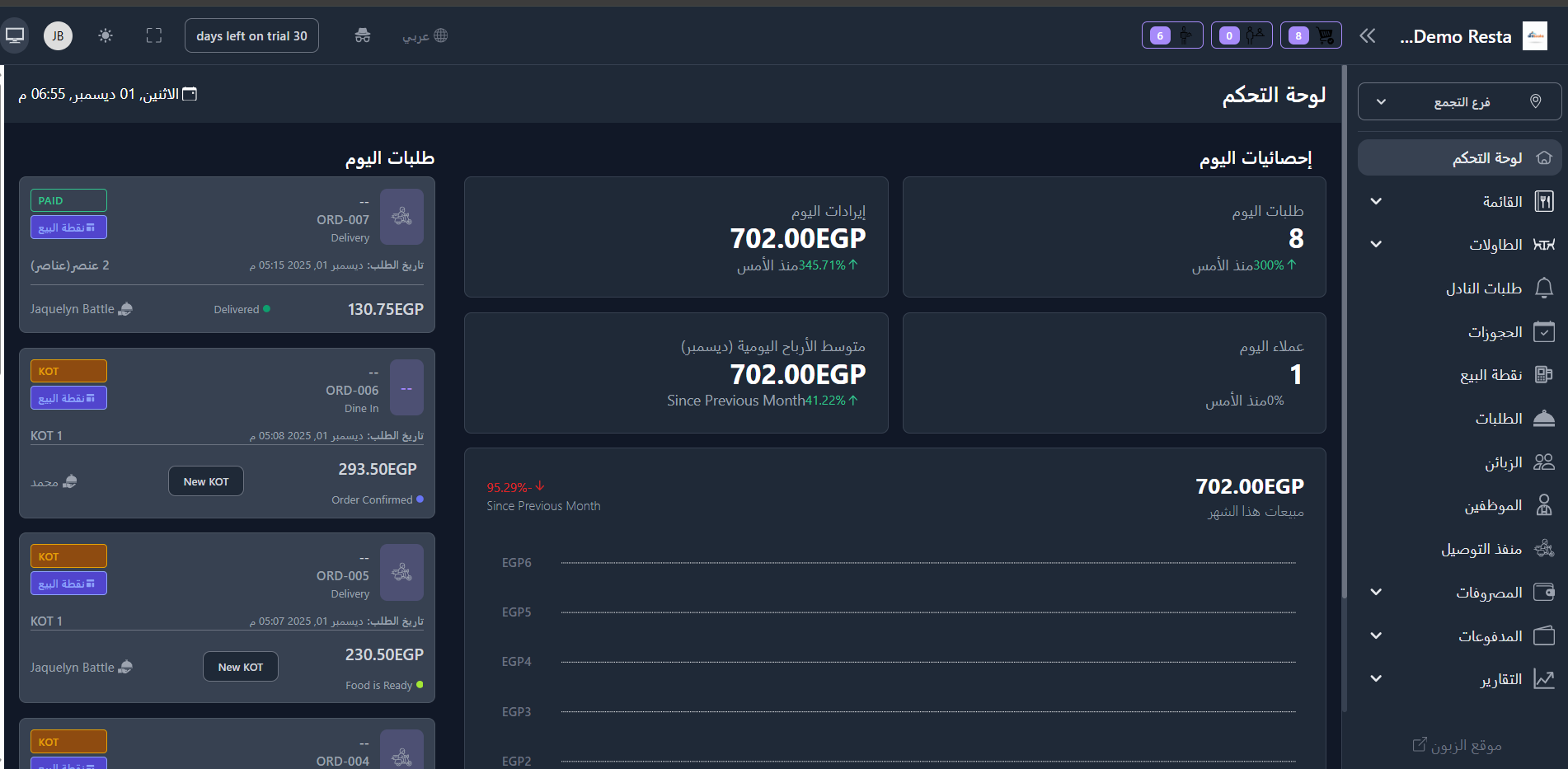 لا تفقد أي طلب بعد الآن. جميع طلبات عملائك، من تناول الطعام في المطعم إلى الطلبات الخارجية، منظمة وسهلة الوصول إليها في مكان واحد. سرّع الخدمة وحافظ على سلاسة عمل مطبخك.